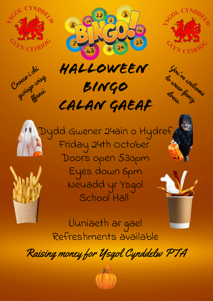 Disco Hydrefol _ Dydd Gwener yma y 24ain Hydref yn Ysgol Cynddelw 1.30 – 3yh. £1 y plentyn. Gwisg ffansi os dymunir. Byrbrydau ar gael i’w prynu, gweler y rhestr prisiau atodedig.
