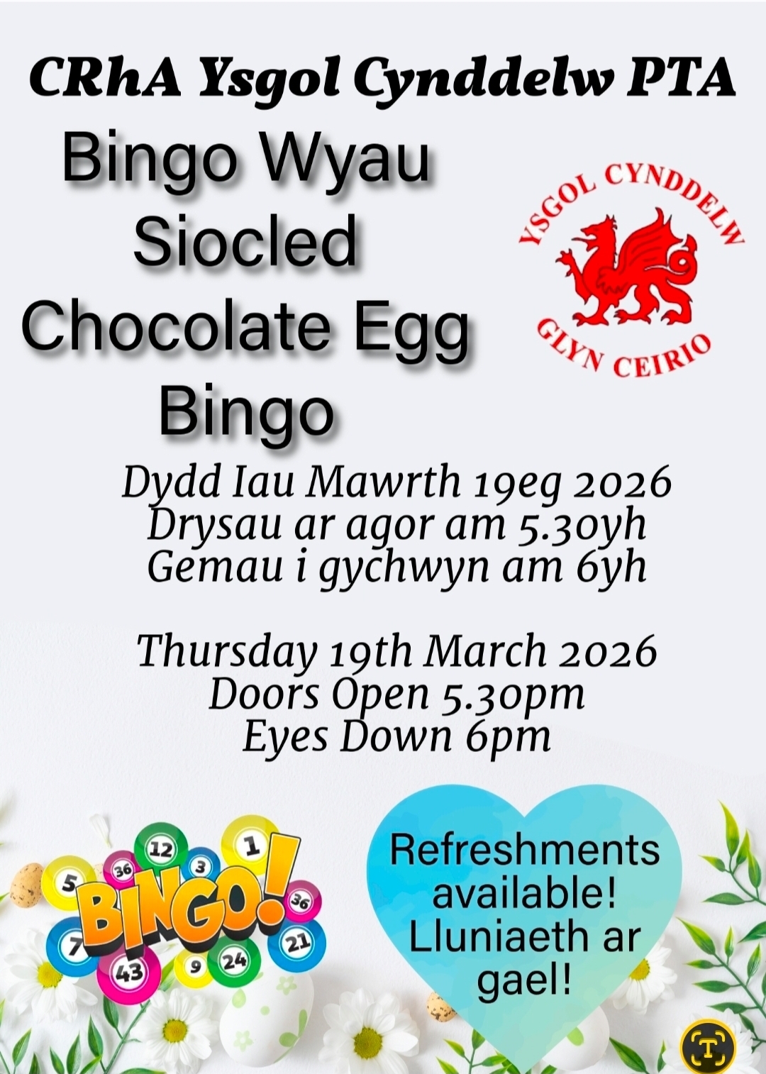 Cofiwch am y Bingo Pasg Dydd Iau yma am 6.00!! Dewch i gefnogi a chymdeithasu!
